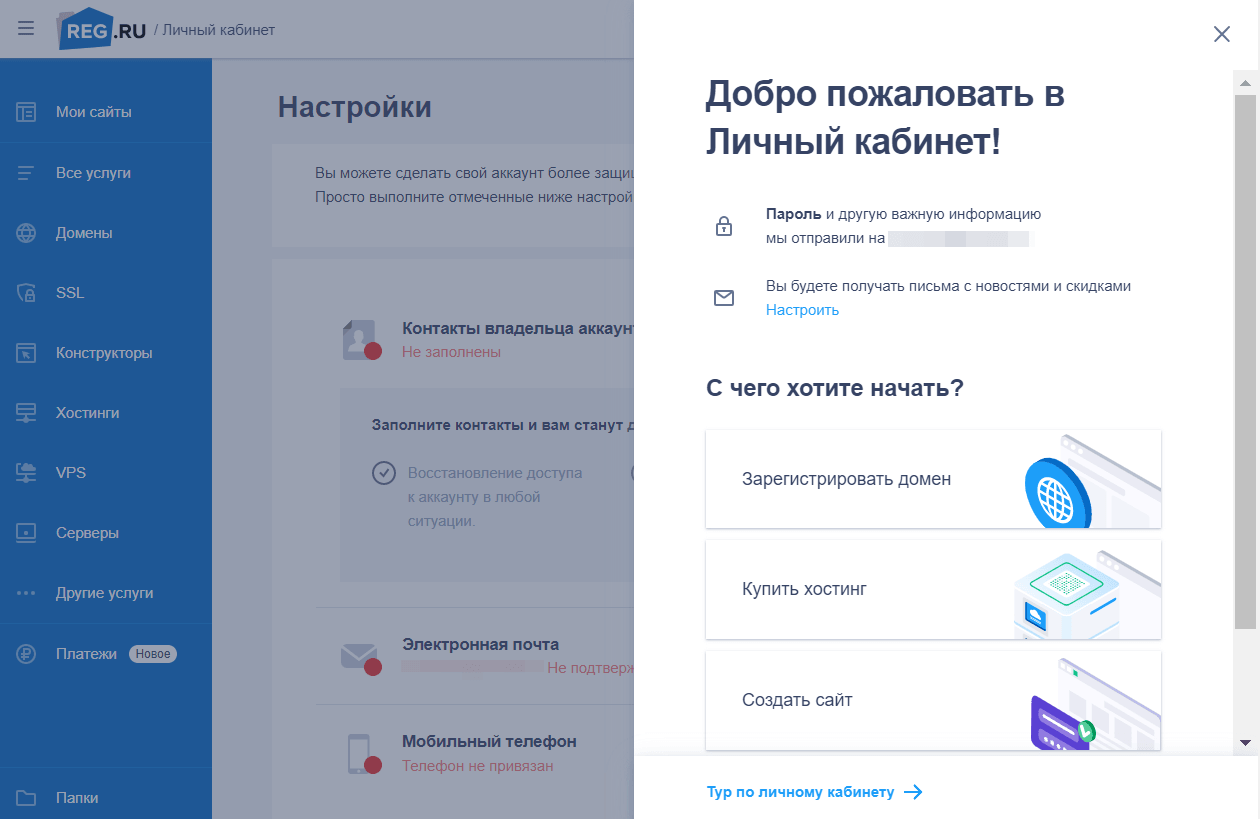 Поп-апы (всплывающие окна). Такие окна могут появляться при первом входе или по мере выполнения каких-либо действий. В них можно добавлять любую необходимую пользователям информацию в виде текста и картинок. К примеру, при первом входе в личный кабинет REG.RU появляется вот такое всплывающее окно: