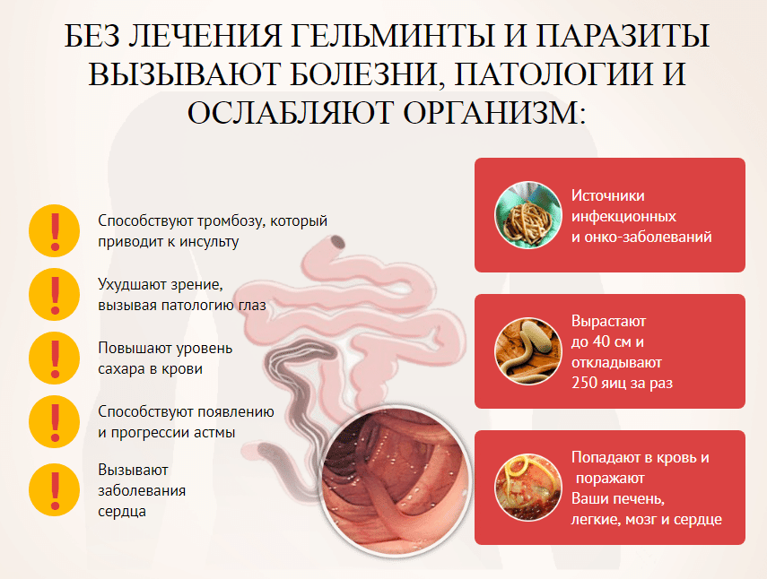 В некоторых случаях появление глистов в организме вызывает более острую клиническую картину. Например, поражение центральной нервной системы, тромбоз сосудов головного мозга, очаговую или мигрирующую пневмонию, гепатиты, бронхоспазм.