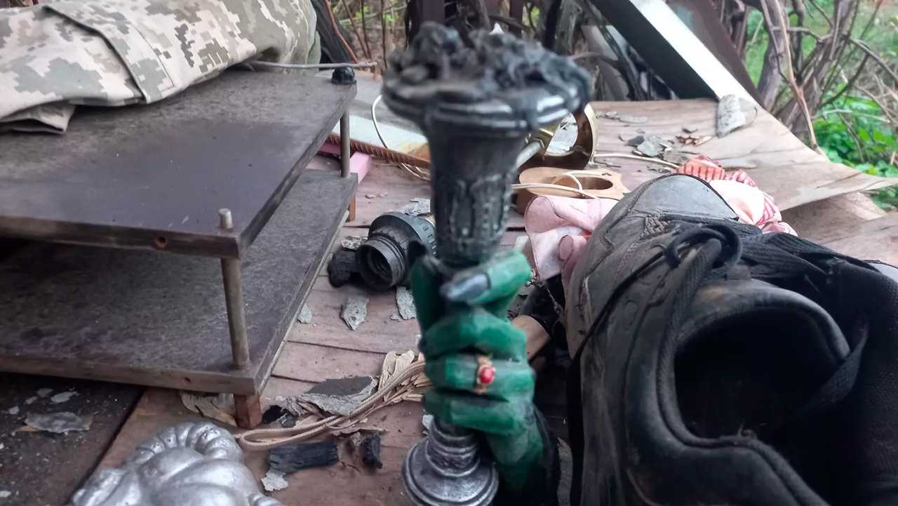 Атрибуты сатанинского капища, найденные на месте, которое раньше занимали силы ВСУ. Село Верхнеторецкое, Донецкая область.