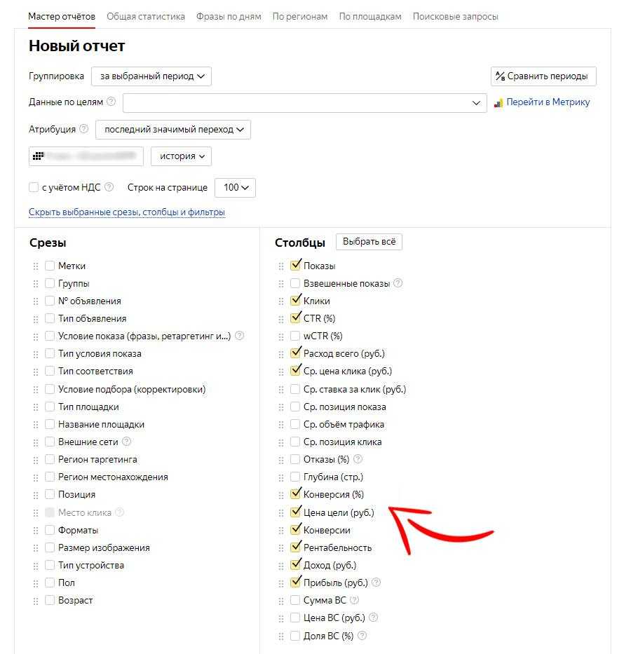 Теперь нужно отметить галочками следующие столбцы: «Конверсия (%)», «Цена цели (руб.)», «Конверсии» — они отвечают за передачу данных по целям, и «Рентабельность», «Доход», «Прибыль» — это данные, которые нужны нам для понимания ценности конверсии при достижении ключевых целей.