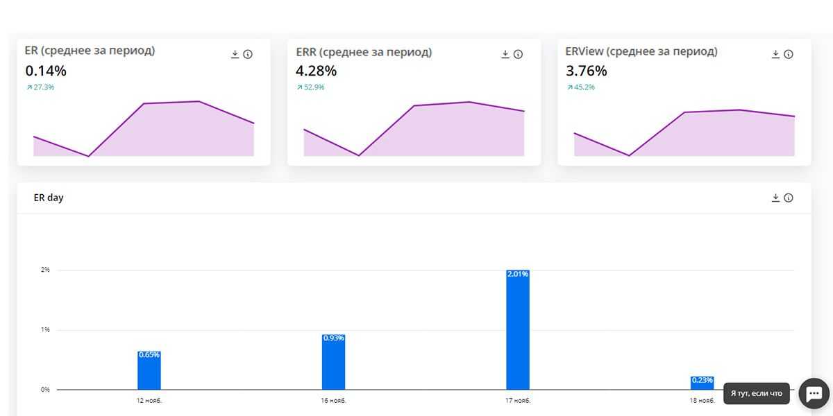 В DataFan можно смотреть разные показатели вовлеченности. Они могут относиться ко всему аккаунту, к конкретному посту, к определенному периоду. А еще есть ER для необычных форматов.