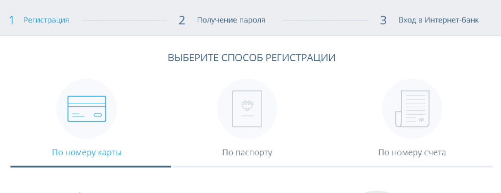 Далее пользователю надо выбрать наиболее подходящий способ совершения регистрации. Система может предложить зарегистрироваться по карте. При необходимости можно активировать другие вкладки, нажав на иконку «Паспорта» или «Номера договора».