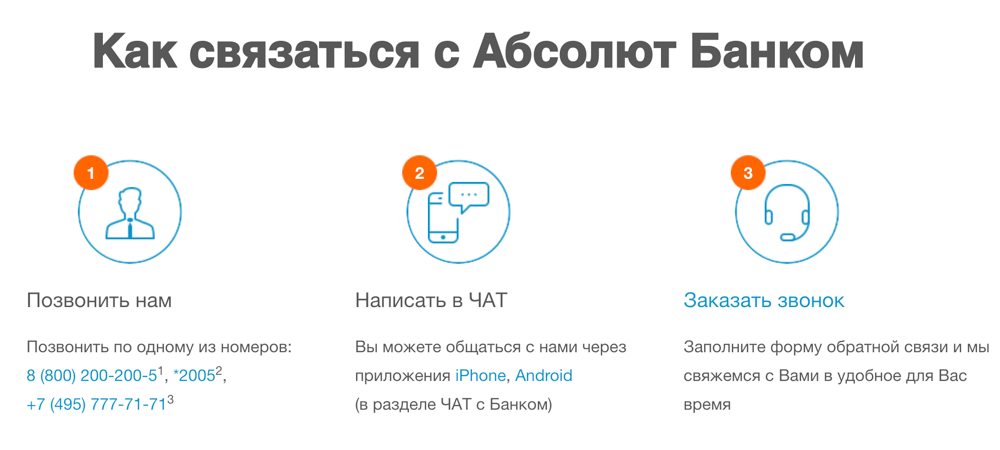 Если возникли трудности или появились вопросы, связанные с Абсолют банком, вы можете поговорить с сотрудниками компании, уточнить у них все детали. Для этого позвоните по одному из номеров: