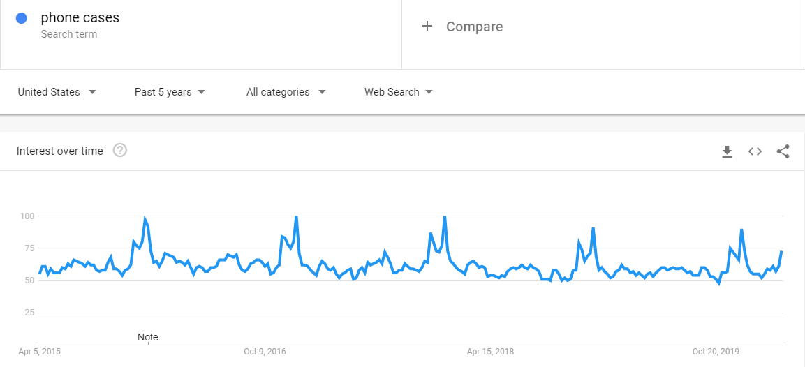 Посмотрите на график из Google Trends, чтобы увидеть, как чехлы для телефонов стали популярными за последние пять лет. Они остаются стабильными продуктами для продажи в сети.