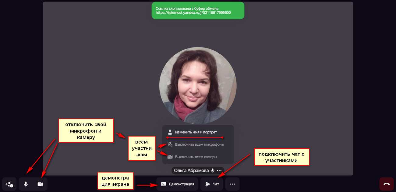 При наведении мышкой на ваше имя отобразится дополнительное меню. Здесь разрешается изменить свое имя и портрет на Яндексе — эти изменения отобразятся в вебинарной комнате. А ещё, одним кликом, вы можете отключить все микрофоны и камеры участников.