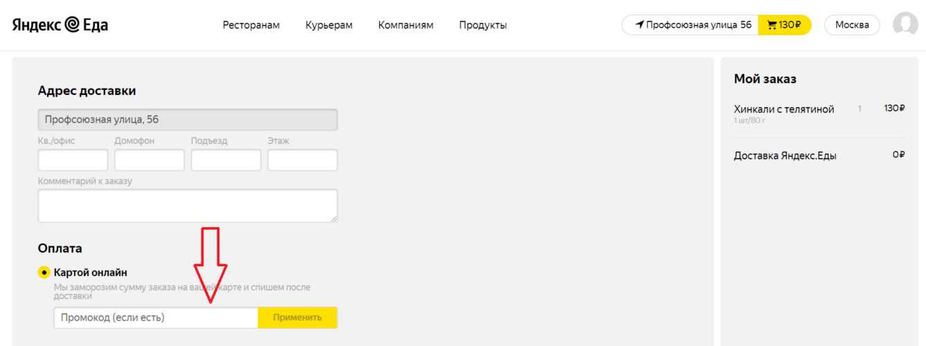 - Далее необходимо подтвердить адрес доставки, добавив номер квартиры или офиса, если это необходимо, выбрать способ оплаты (наличными или картой) и ввести промокод при его наличии.