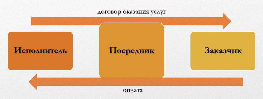 Исполнитель и заказчик напрямую не взаимодействуют. Заключается договор исполнителя услуг с посредником, он, соответственно, с заказчиком. Денежный расчет проходит через посредника, который передает деньги от заказчика к исполнителю, оставляя себе комиссионный сбор.