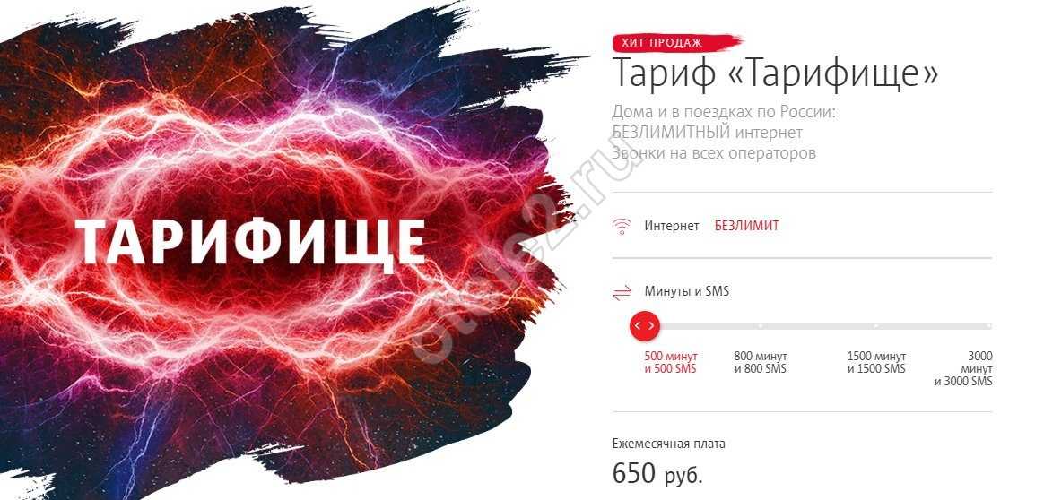 | «Тарифище» | Тариф доступен для всех регионов России. Предоставляется выбор от 500 до 3000 минут, смс по предоплатной системе расчетов. | В зависимости от выбранного пакета: от 650 до 1550 |