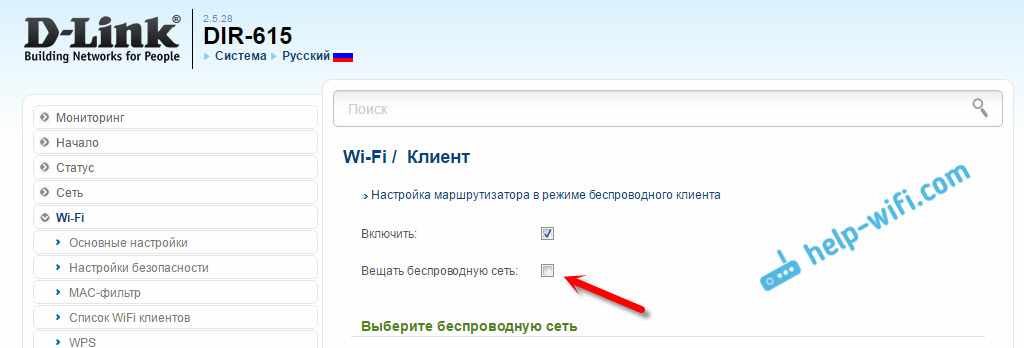 По сути, режим ‘Клиент’, это и есть режим адаптера. Ведь роутер по Wi-Fi подключается к другому роутеру, и передает интернет по сетевому кабелю. Настраиваем все точно так же, как я показывал в первом разделе этой статьи. Только, если вам не нужен интернет по Wi-Fi от второго маршрутизатора, а только по кабелю, то в процессе настройки уберите галочку с пункта ‘Вещать беспроводную сеть’.