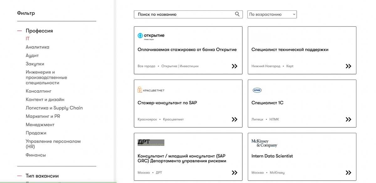 Фишка сайта — подборки стажировок по разным критериям, например, по компании-работодателю и оплате
