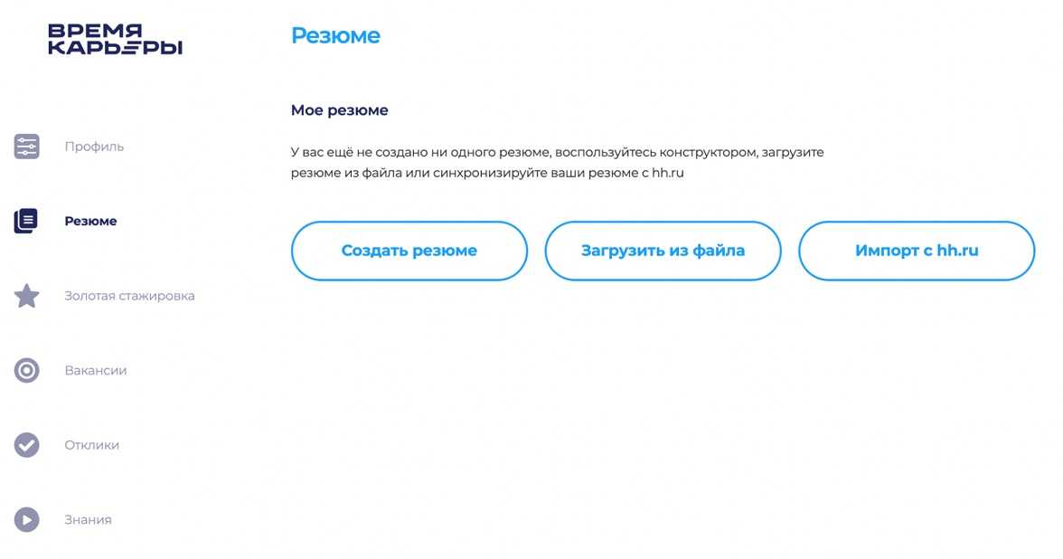 Чтобы откликнуться на стажировку, можно составить резюме на сайте, загрузить его из файла или импортировать с hh.ru — а затем переслать его работодателю