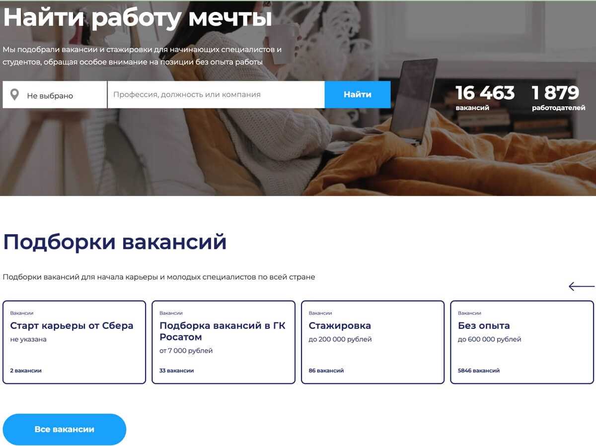 На сайте публикуются стажировки и вакансии для специалистов в том числе без опыта работы. Много предложений для удалёнщиков.