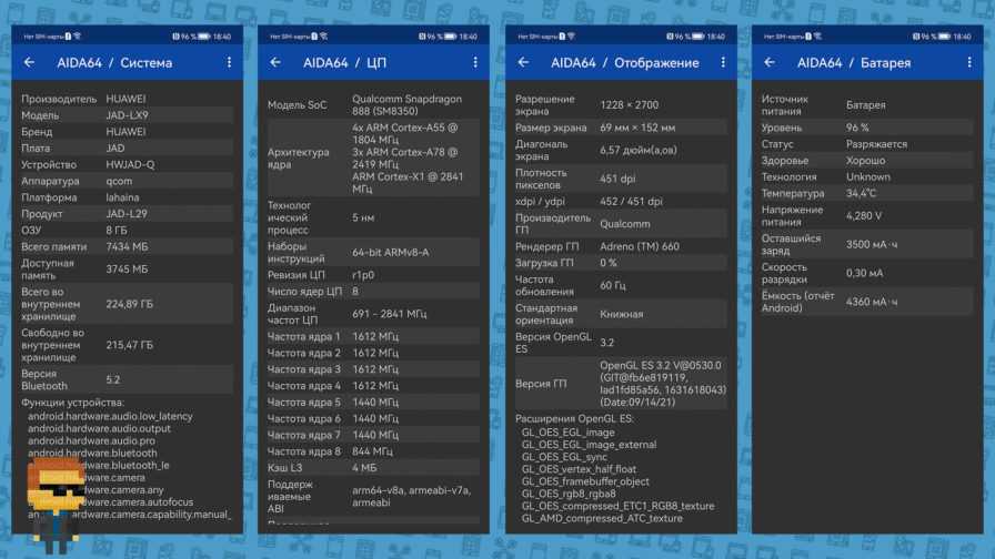 Восьмиядерный Snapdragon 888 4G имеет одно ядро Cortex-X1 с частотой 2.84 ГГц, три Cortex-A78 (2.42 ГГц) и еще четыре энергоэффективных Cortex-A55 (1.8 ГГц). К производительности этого SoC вопросов уже давно не возникает, но не каждая система охлаждения с ним справится. На удивление, при серьезной нагрузке Р50 греется не так сильно. Соответственно, ощутимого снижения тактовой частоты не происходит, а производительность в играх не падает.
