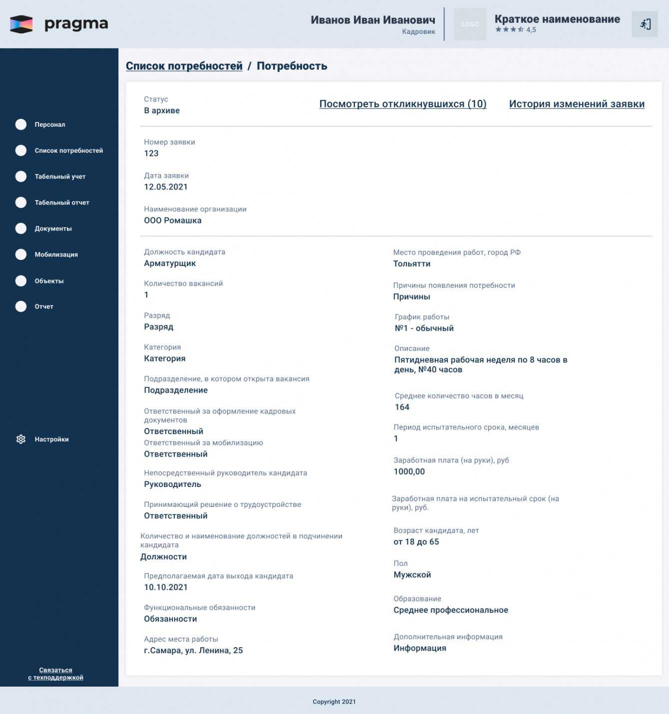 The foreman forms applications on the platform, conducts interviews with candidates, can maintain personnel records in the mobile application, which is also available to specialists responsible for dispatching.
