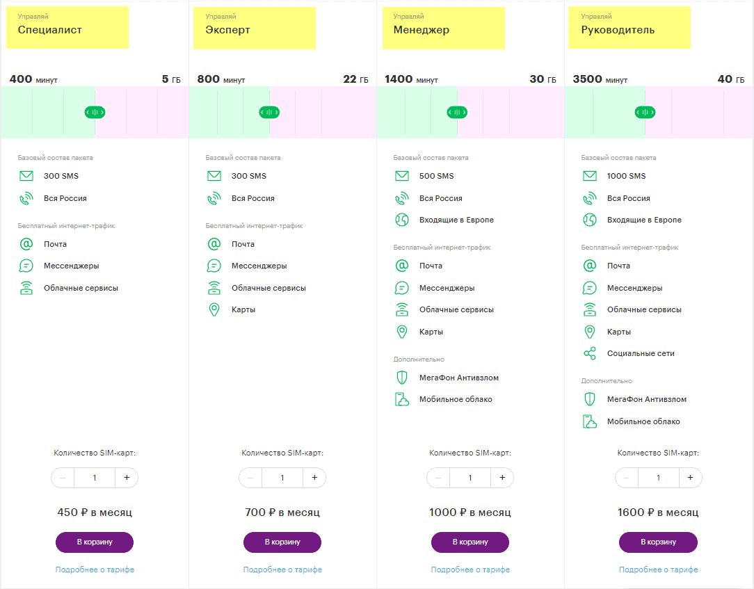 В личном кабинете каждый тариф можно настроить под нужды компании, в частности, тариф «Управление» имеет уровни для специалиста, менеджера, менеджера и эксперта: количество минут и SMS, количество подключенных SIM-карт, объем интернет-трафика, возможность безлимитного использования настроен мессенджером, электронной почтой и социальной сетью.