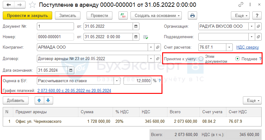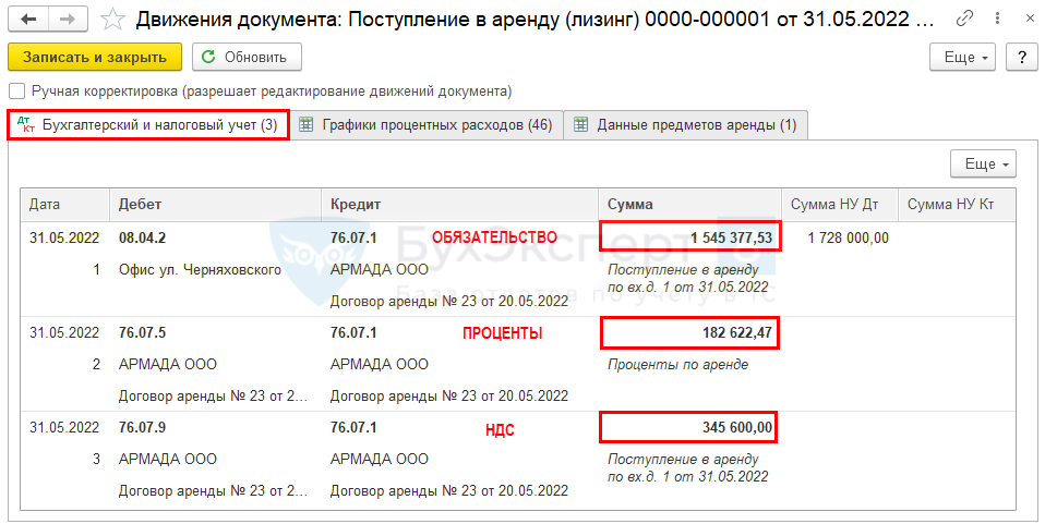 | 31 мая | 08.04.2 | 76.07.1 | 1 545 377,53 | 1 728 000 | Учет арендных обязательств | Поступление в аренду | |