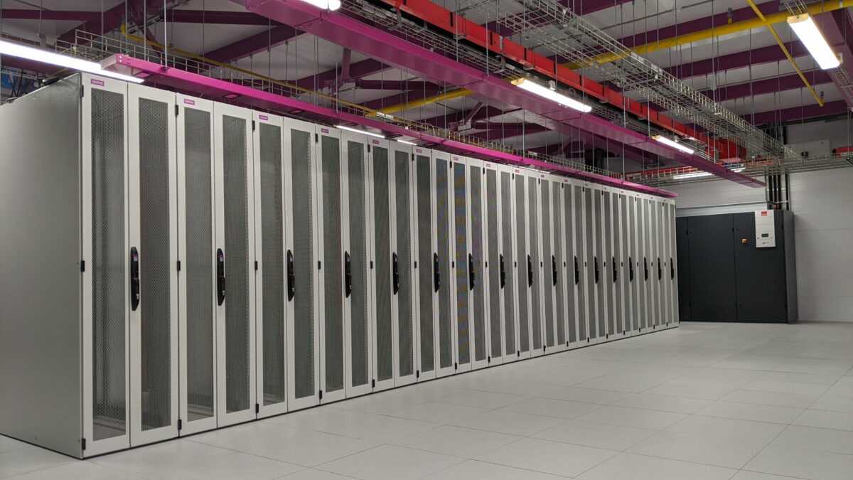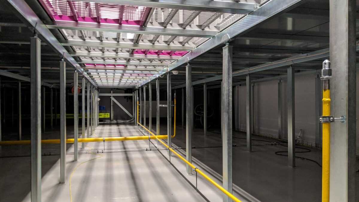 Внутри два ряда серверных шкафов, над ними балки несущей конструкции, которые служат также основами для крепления проволочных лотков, разводящих коммуникации между шкафами.