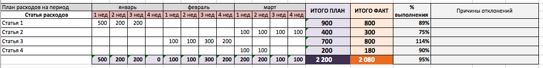 В последних столбцах таблицы сравните плановые и фактические затраты. Это покажет, какая часть выделенного бюджета была потрачена. Опишите основные причины отклонения от факта плана. Если была существенная экономия, обязательно укажите на это и напишите, как она была достигнута.