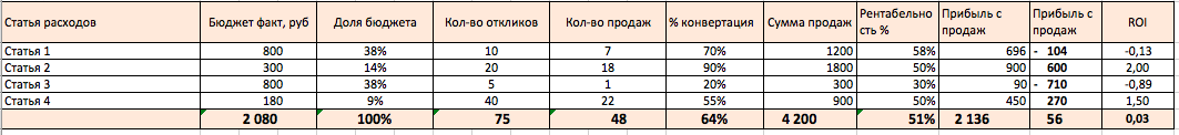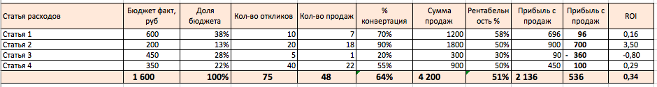 После общего анализа оцените эффективность рекламы постатейно. Для каждой статьи затрат (канала связи) рассчитайте такие показатели, как отклик, конверсия и рентабельность инвестиций.