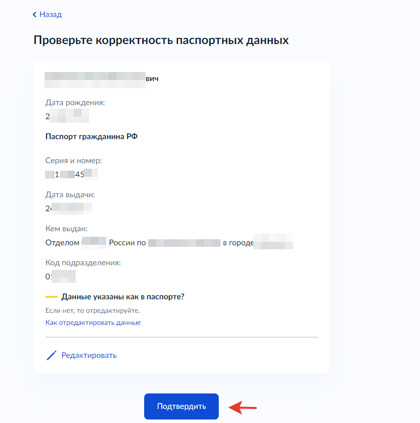 Затем проверьте корректность паспортных данных, при необходимости отредактируйте данные и нажмите на кнопку «Подтвердить»;