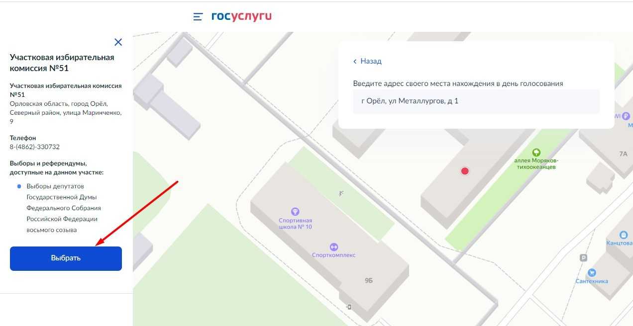 проверяем сведения из паспорта, телефон. Далее откроется карта, там вводим адрес, где будем находиться в назначенный день. На карте появятся участки голосования, выбираем любой нужный;