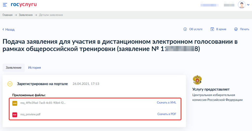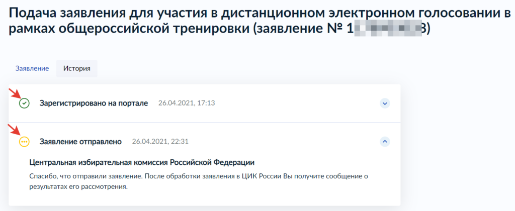 Вот, собственно, и всё! Заявление будет зарегистрировано на портале, и вы сможете принять участие в общероссийской тренировке дистанционного электронного голосования с 12 мая, перейдя на портал vybory.gov.ru .