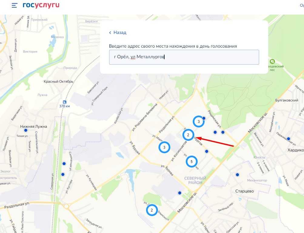 жмем на кружок на карте, точка будет приближена, выбираем участок, нажав еще раз по синему кружку. Далее с левой стороны откроется наименование и адрес голосования, там уже делаем подтверждение;