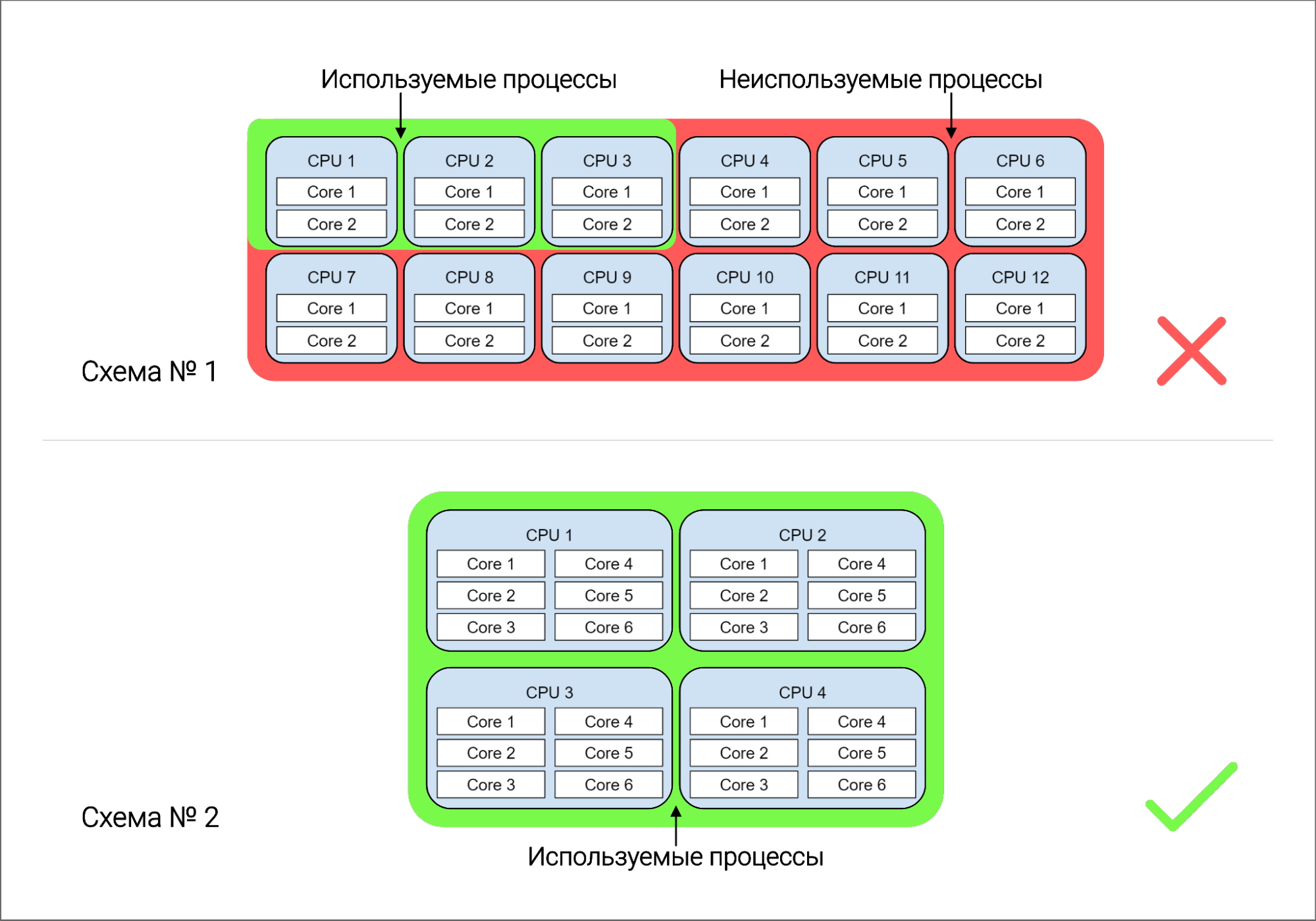 Рисунок 4. Неправильная и правильная настройки процессоров. В схеме № 1 MS SQL использует только 4 процессора из 12, а в схеме № 2 — все 12