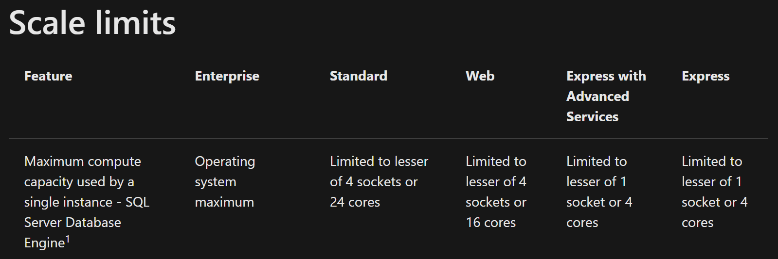 Их важно учитывать при настройке окружения. Например, версия MS SQL Standard 2016 может использовать либо 4 сокета, либо 24 ядра, исходя из того, чего меньше (данные из таблицы на сайте Microsoft Ignite)