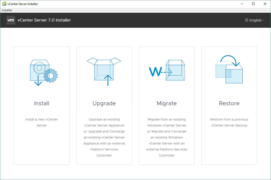 Для установки vCenter 7.0 сохраняем скаченный ISO на управляющую средой vSphere машину с Windows в D:\Install\VMware\VMware vSphere 7\VMware vCenter 7. Далее монтируем ISO-образ как виртуальный диск DVD на компьютере, с которого осуществляется подключение к ESXi-хостам, либо извлекаем содержимое в каталог пользователя. Переходим в каталог «vcsa-ui-installer\win32» и запускаем «installer.exe» (в случае с Linux ищем каталог «vcsa-ui-installer/lin64»). Нажимаем «Install» для установки нового vCenter Server: