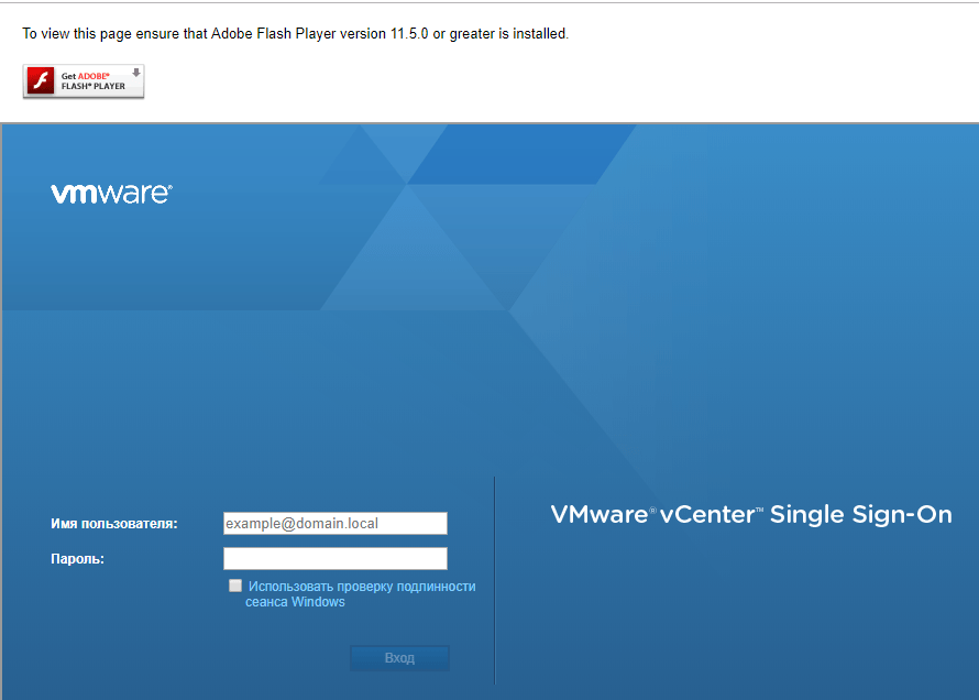 Жмакнув на ссылку vSphere Web Client откроется страница входа, где, разрешив использование флэш-плеера