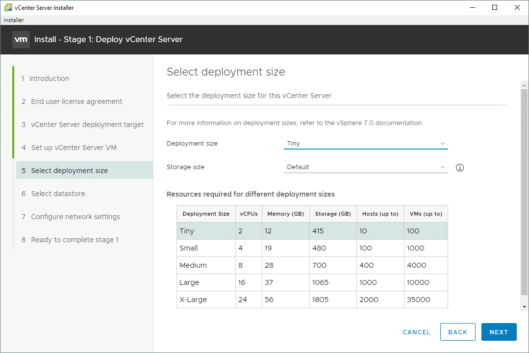 Set deployment size. Выбираем тип размера развертывания (у нас — Tiny) и размер хранилища. Прямо под полями удобная табличка для сопоставления нужного количества хостов и машин с типом развертывания, параметрами памяти, размера хранилища и количеством vCPU: