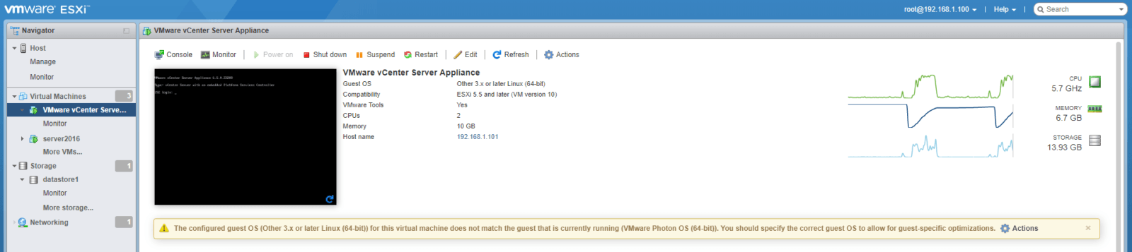 Если после установки VCSA вы получите сообщение «The configured guest OS (Other 3.x or later Linux (64-bit)) for this virtual machine does not match the guest that is currently running (VMware Photon OS (64-bit)). You should specify the correct guest OS to allow for guest-specific optimizations», значит виртуальное оборудование нужно обновить до версии 6.5(VM Version 13).