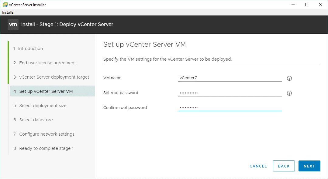 Set up vCenter Server VM. Здесь вводится имя vCenter VM и устанавливается пароль администратора для vCenter Server Appliance: