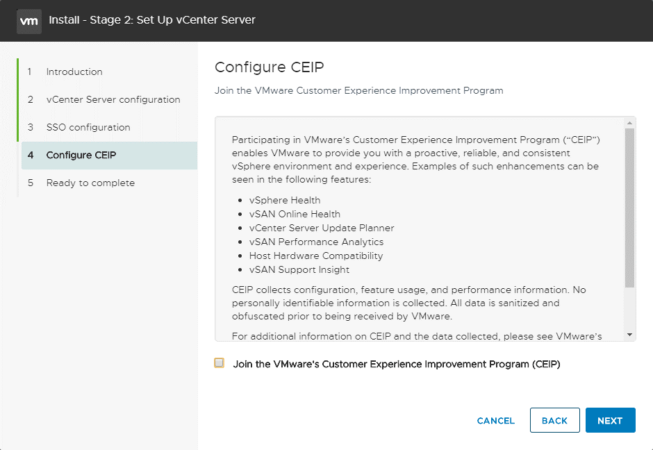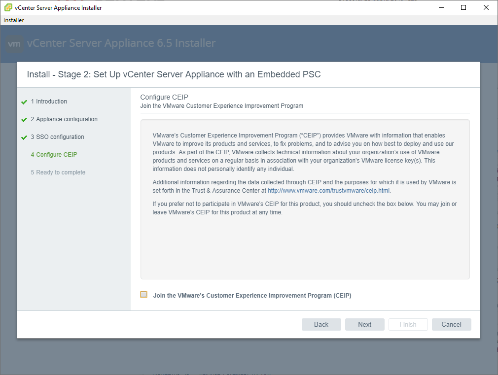 Configure CEIP. Убираем галочку, если не хотим отправлять статистику в VMware и идем далее: