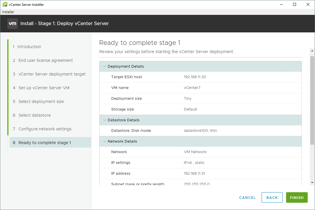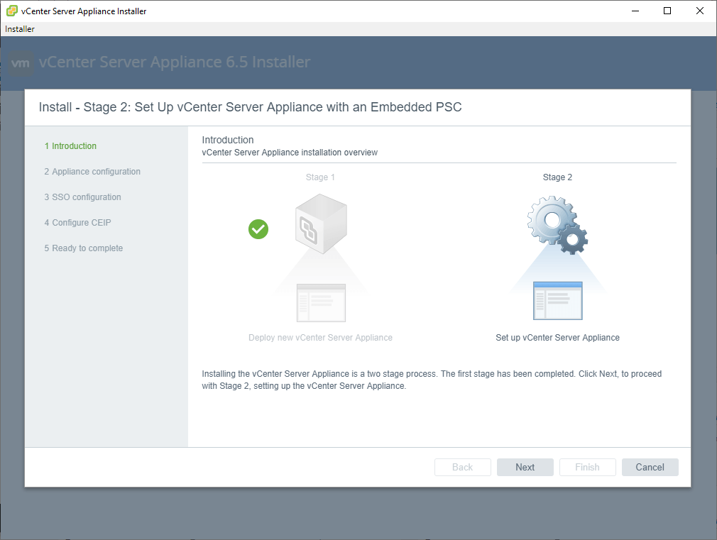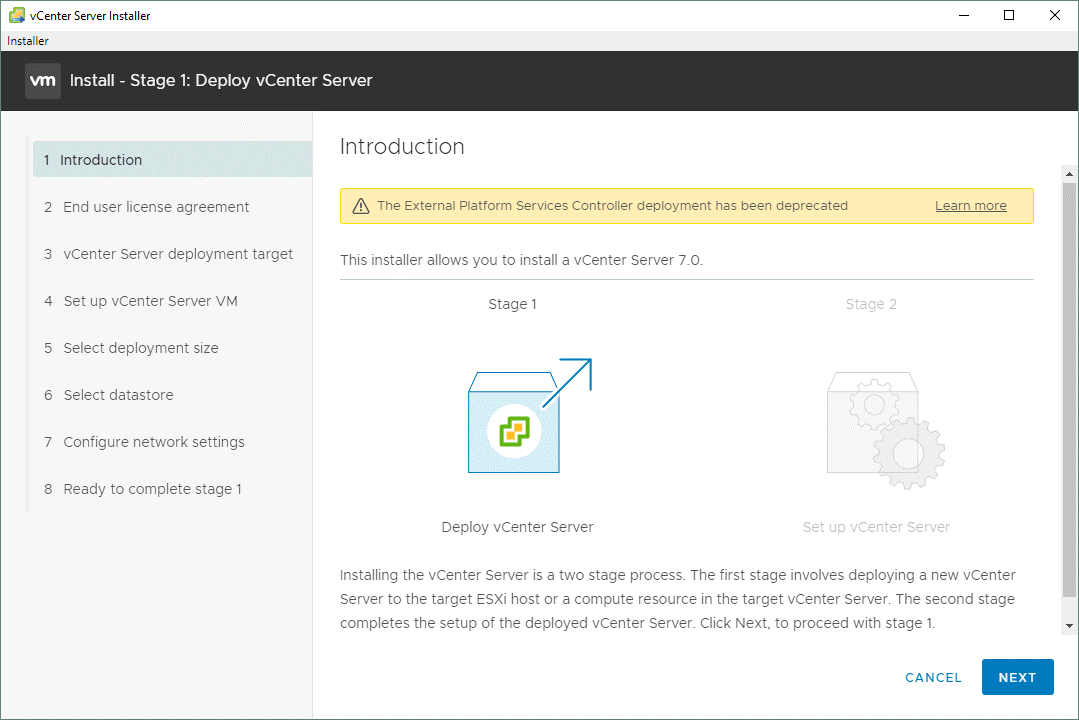 Мастер-установщик vCenter Server проходит два этапа.
