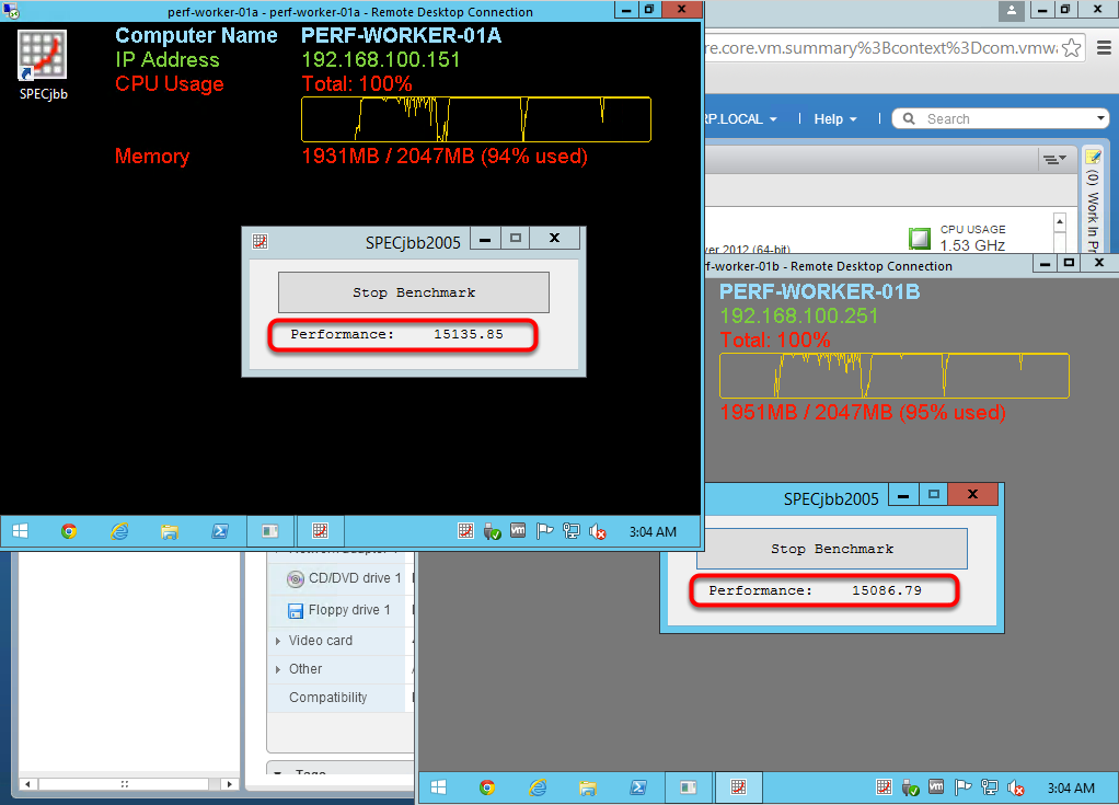 Скрипт имитирует ресурсоемкий процесс загрузки CPU виртуальных машин: PERF-WORKER-01Aи PERF-WORKER-01B, а графический интерфейс отображает значения производительности в режиме реального времени. Как видите, отметка производительности близка к значению 15 000.