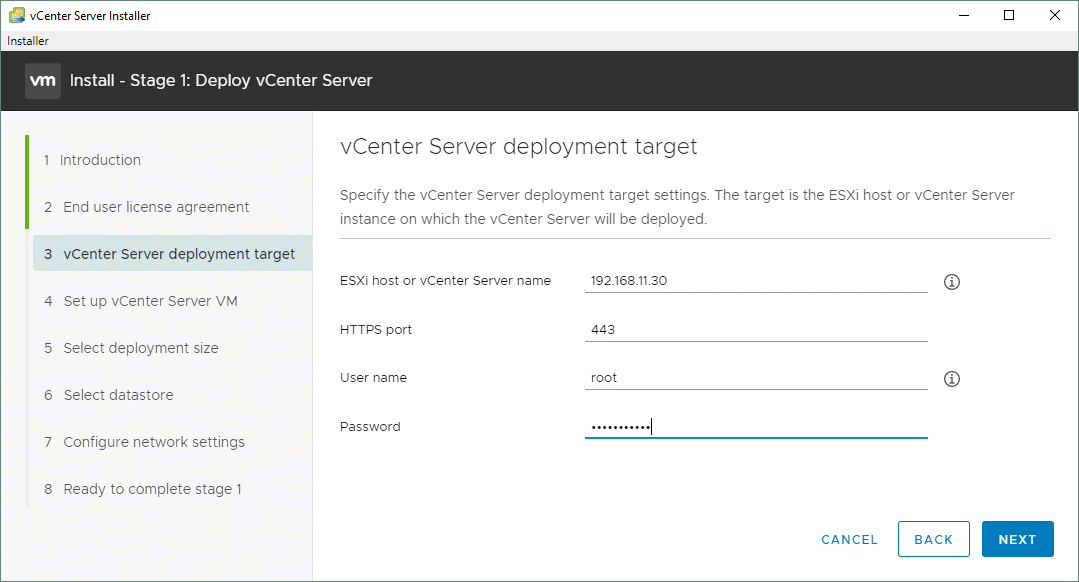 vCenter Server deployment target. На этом этапе следует указать параметры первого хоста ESXi, где будет развернут в итоге vCenter: