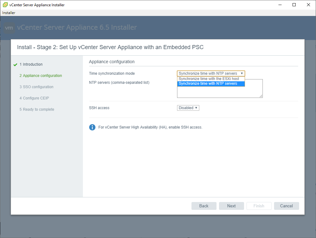 Time synchronization mode: Synchronize with the ESXi host