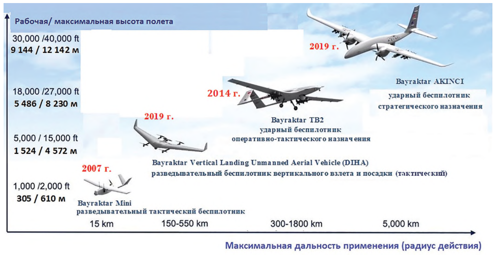 В силу целого ряда обстоятельств из многочисленных беспилотных авиационных комплексов военного назначения, производимых в вышеперечисленных странах, наиболее известным стал турецкий комплекс «Байрактар-ТБ2» (Bayraktar ТВ2). Он получил свое название по фамилии семьи турецких предпринимателей (отца и двух сыновей), владеющих компанией «Baykar Makina». Фамилия владельцев компании переводится с турецкого как «Знаменосец». «Baykar Makina» была основана в 1986 г. и занималась производством и поставками запасных частей к автомобилям. В 2000-х годах «Baykar Makina» превратилась в ведущую турецкую компанию по производству беспилотных летательных аппаратов. Этот процесс тесно связан с деятельностью Сельчука (1979 г.р.), младшего сына О. Байрактара, основателя компании. Сельчук является талантливым инженером и учёным, энтузиастом внедрения беспилотных технологий в летательныё аппараты.