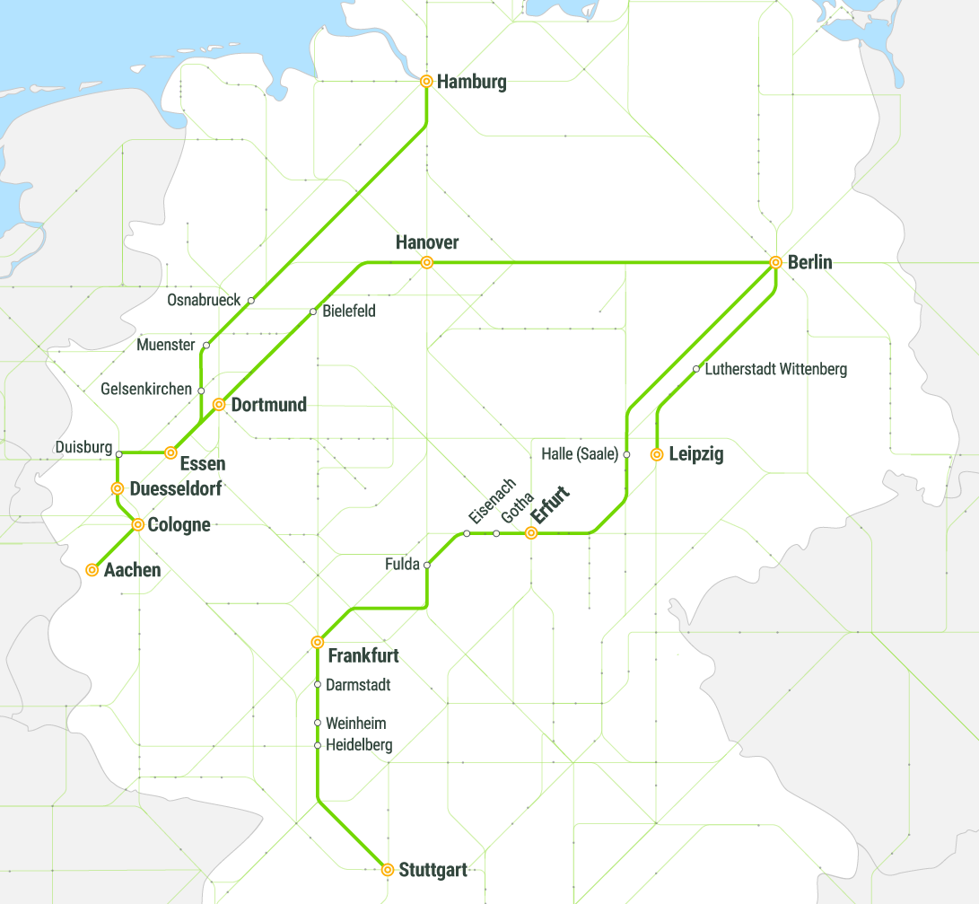 Пока поезда Flixtrain можно встретить не по всей стране. Основные маршруты: Гамбург — Кельн, Берлин — Кельн, Берлин — Штутгарт. Поезд Берлин — Штутгарт проходит через Франкфурт.