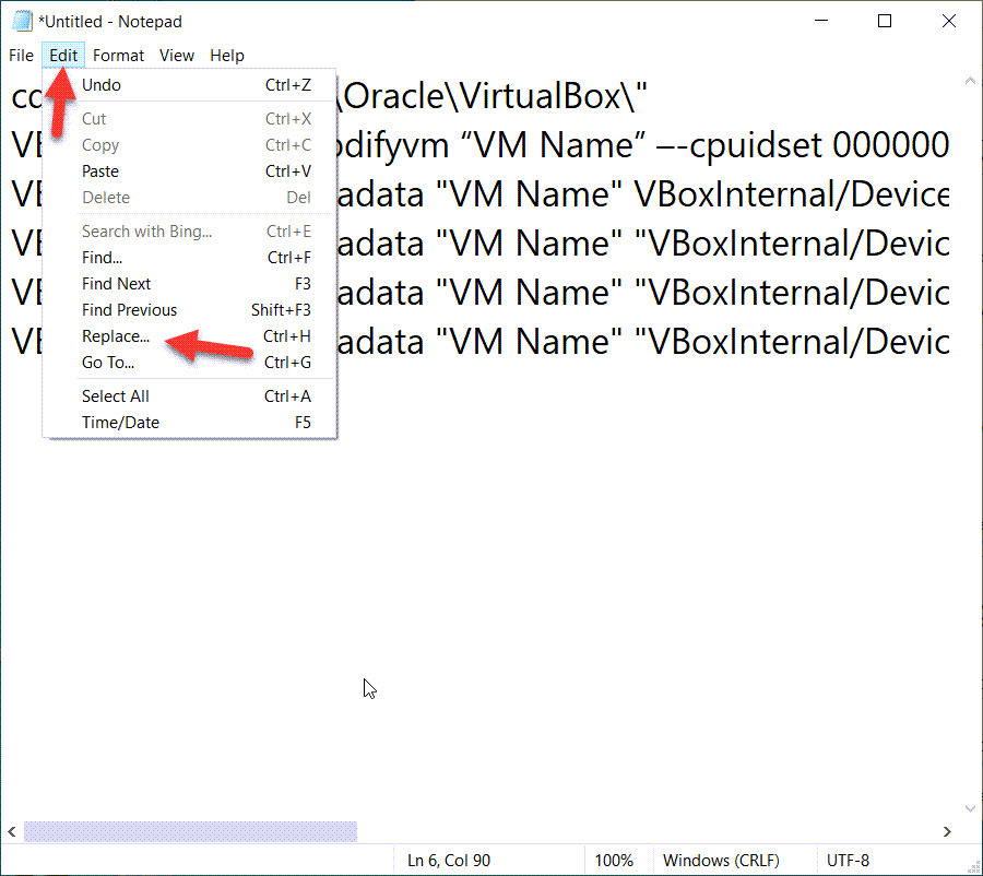 - Затем, используя функцию «Найти и заменить» в вашем редакторе, замените имя виртуальной машины «VM Name» на имя виртуальной машины из программы VitrualBox, которую вы создали минуту назад.