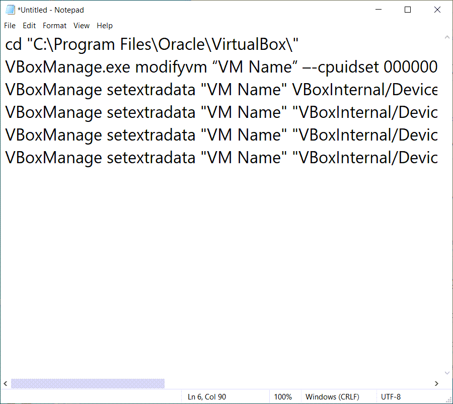 cd "C:\Program Files\Oracle\VirtualBox\"VBoxManage.exe modifyvm "VM Name" –-cpuidset 00000001 000106e5 00100800 0098e3fd bfebfbffVBoxManage setextradata "VM Name" "VBoxInternal/Devices/efi/0/Config/DmiSystemProduct" "MacBookPro15,1"VBoxManage setextradata "VM Name" "VBoxInternal/Devices/efi/0/Config/DmiBoardProduct" "Mac-551B86E5744E2388"VBoxManage setextradata "VM Name" "VBoxInternal/Devices/smc/0/Config/DeviceKey" "ourhardworkbythesewordsguardedpleasedontsteal(c)AppleComputerInc"VBoxManage setextradata "VM Name" "VBoxInternal/Devices/smc/0/Config/GetKeyFromRealSMC" 1