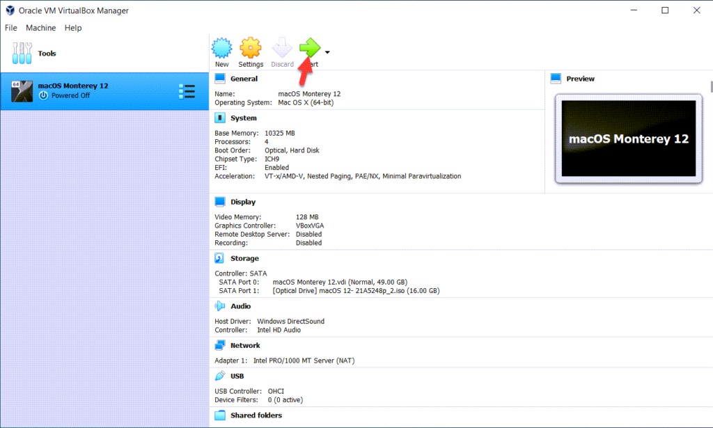 - После создания виртуальной машины вы вернетесь на главную страницу VirtualBox. Нажмите на «Настроить» macOS Monterey.