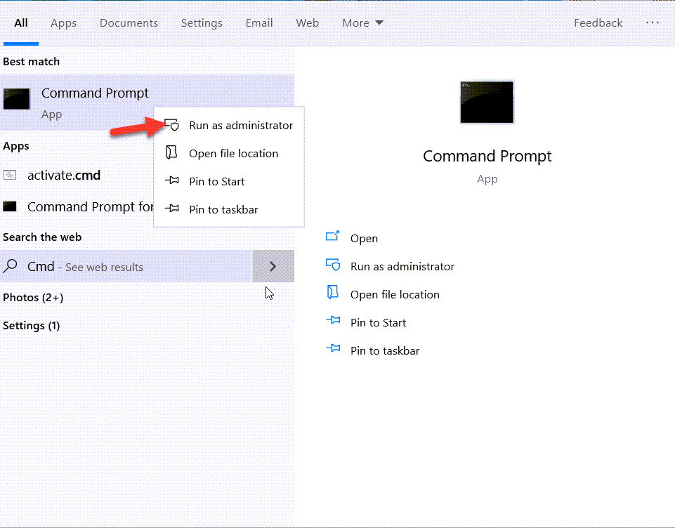 Щелкните правой кнопкой мыши CMD и выберите «Запуск от имени администратора».