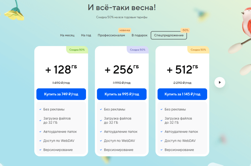Цена: От 149 до 4490 рублей в месяц. При годовой оплате существуют скидки. Также действуют сезонные акции, как видно на скриншоте.