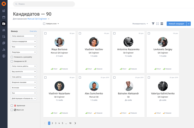 - CleverStaff. Хороший сервис для хранения данных о потенциальных сотрудниках. Подходит для рекрутинговых компаний, так как ПО удобно пользоваться ежедневно. Основные преимущества приложения: добавление кандидатов в 1 клик, синхронизация соискателей с новыми резюме и информацией с job-сайтов, детальная аналитика работы эйчарщиков, статистика по каждой отдельной вакансии. Кроме того, с помощью CleverStaff можно вытягивать информацию с сайта анонимного поиска работы Djinni, находить соискателей в соцсетях Facebook и ВКонтакте по заданным профессиям.