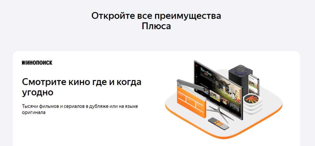 Яндекс Плюс — это фильмы и сериалы на Кинопоиске, музыка и подкасты на Яндекс.Музыке, привилегии при хранении файлов на Яндекс.Диске, а также кешбэк баллами в Яндекс.Еде и Яндекс.Такси, которые можно копить и тратить на новые поездки и заказы в сервисах Яндекса.