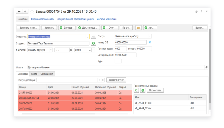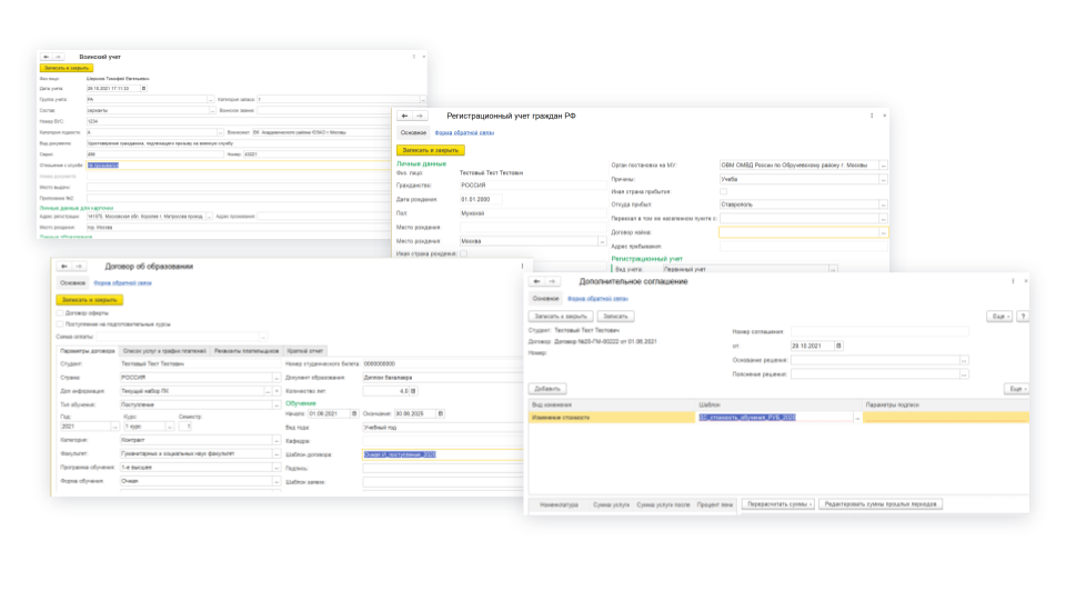 Макеты печатных форм договоров, студенческих билетов, счетов, справок, документов миграционного и регистрационного учёта находятся в периферийных базах данных. Из модуля 1С:CRM отправляется запрос в периферийную систему, где формируется шаблон. Он отображается в 1С:CRM в рамках заявки.