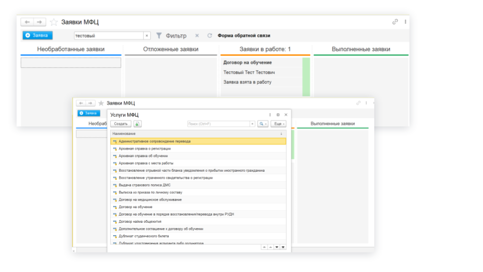 «Заявка» работает со всеми 68 видами услуг, которые предоставляет МФЦ. Каждая из услуг имеет свои особенности. Например, студент приходит поменять фамилию, имя, отчество. Создаётся приказ, который будет менять эти данные: новая информация автоматически скорректируется в ведомостях на фиксирование промежуточной успеваемости и во всех другие виды документов, которые будут существовать, пока студент учится в РУДН.